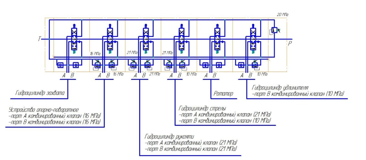 Гидрораспределитель 6РС100 Т2..... производства Быдышность (Болгария) Является заменой распределителя Валвоил и устанавливается на манипуляторы производства Велмаш с 7-ю предохранительными клапанами серии Zу. Данные распределители устанавливаются и на экскаватор МТЗ с джойстиками и без. Давление на входе 210 Бар. Пропускная способность 100 литров . Распределитель секционный и может комплектоваться от 1-й до 8 ми секций . Управление может быть -Ручным, Электромагнитным , пневматическим и электрогидравлическим.